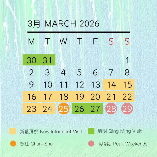 为了方便家属在清明期间前来祭扫,园区将在以下 6 天尖峰日期提早于上午 6:00 AM 开放,至下午 5:00 PM。